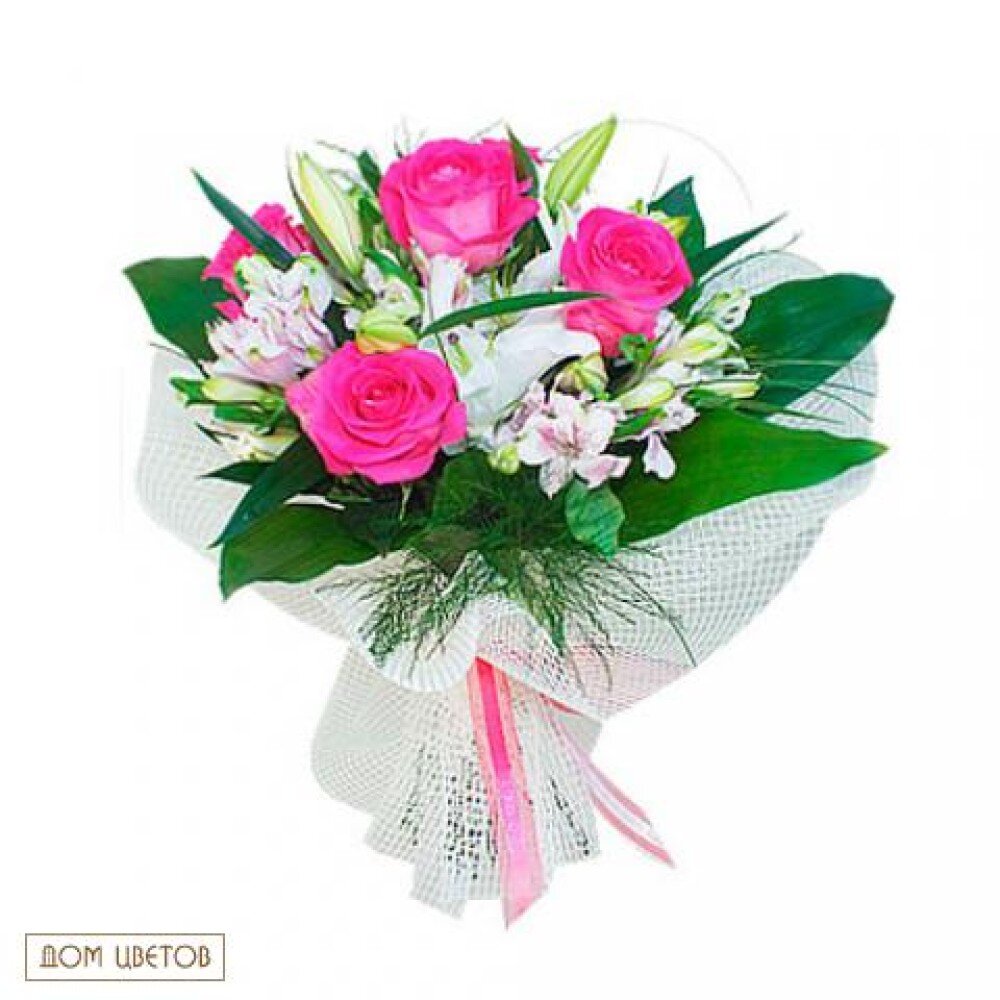 Роза - 5шт. Лилия - 1шт. Альстромерия - 5шт. Цвет на наличие. Писташ - 4шт. Упаковка Лента
