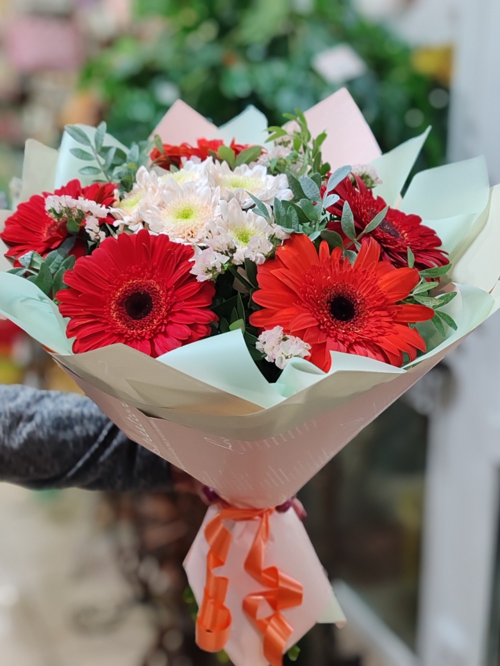 Хризантема кустовая - 1 шт. Цвет на момент оформление заказа. Гербера - 5 шт. Цвет на момент оформление заказа. Писташ - 2 шт. Статица - 1 шт. Оформление