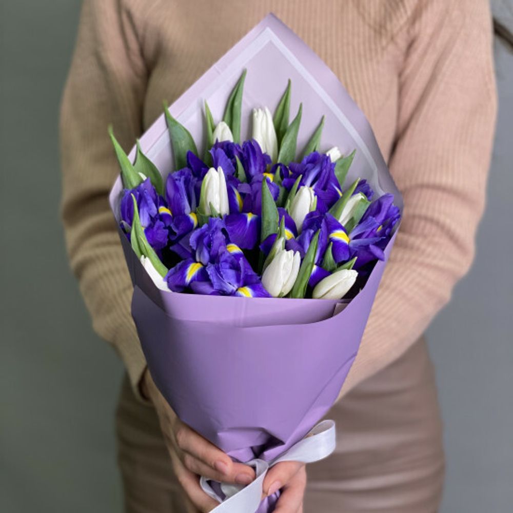 Тюльпаны - 11 шт. Ирис - 10 шт. Упаковка Лента