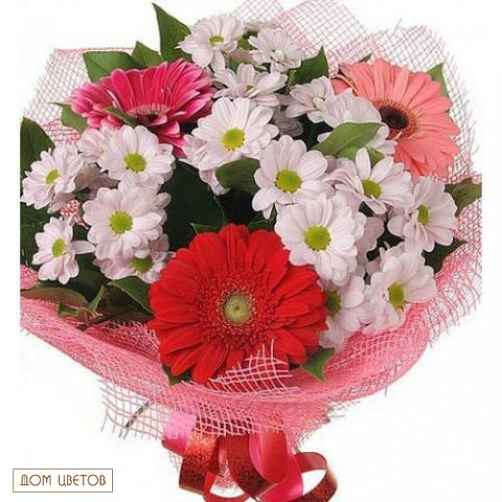 Гербера - 3шт. Цвет на момент оформление заказа. Хризантема - 4шт. Цвет на момент оформление заказа. Писташ - 3шт. Упаковка Лента
