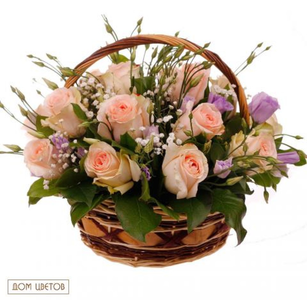 Роза Эквадор - 15шт. Эустома - 3шт. Гипсофила - 2шт. Рускус - 9шт. Основа Корзина